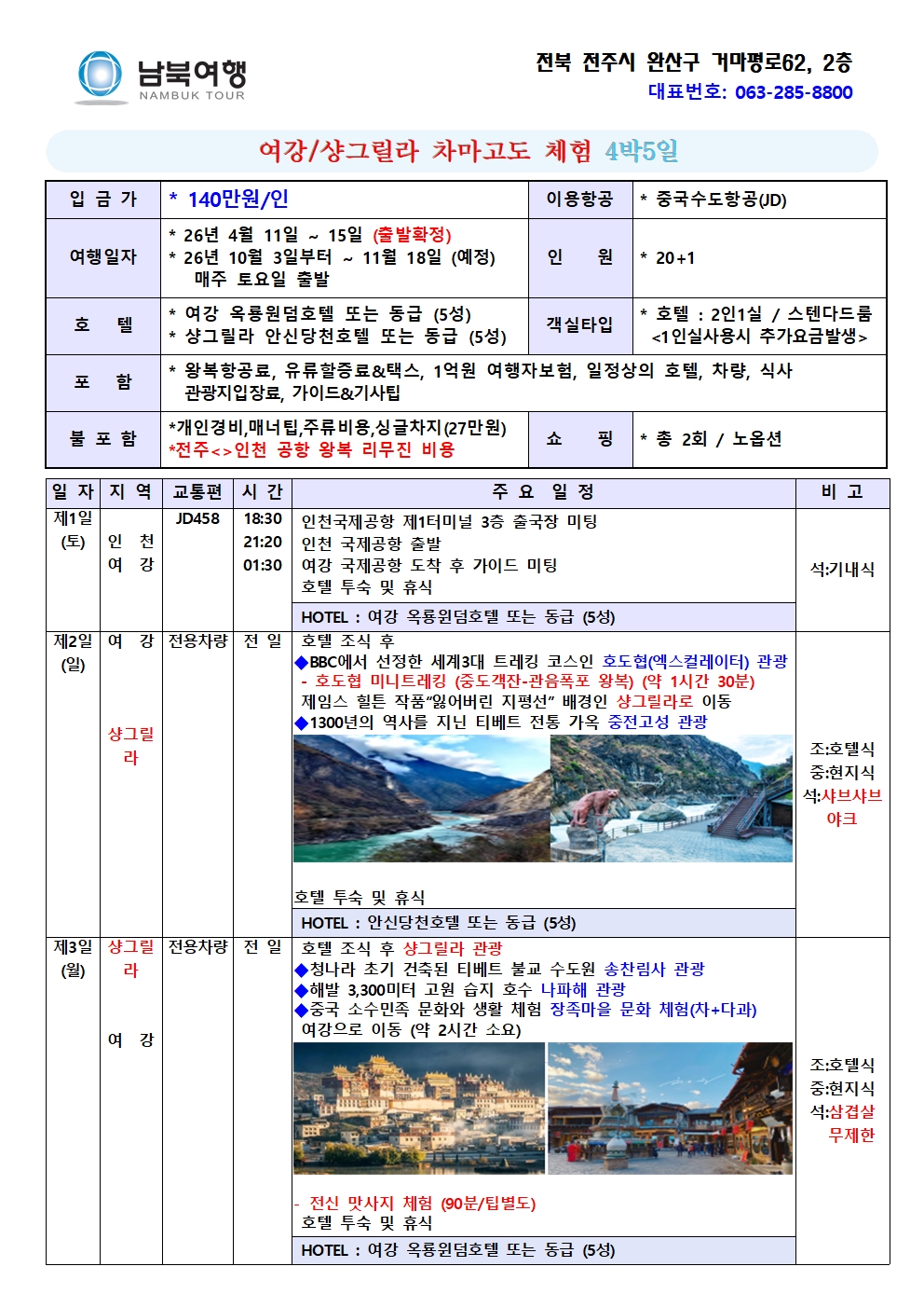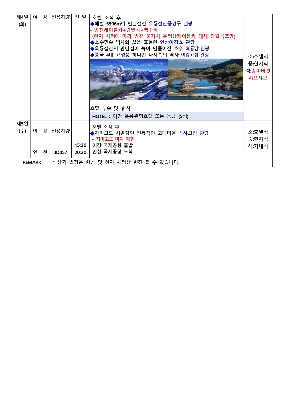 [수도항공]여강 샹그릴라 차마고도 체험 4박5일★호도협 미니트레킹/장족마을/옥룡설산풍경구