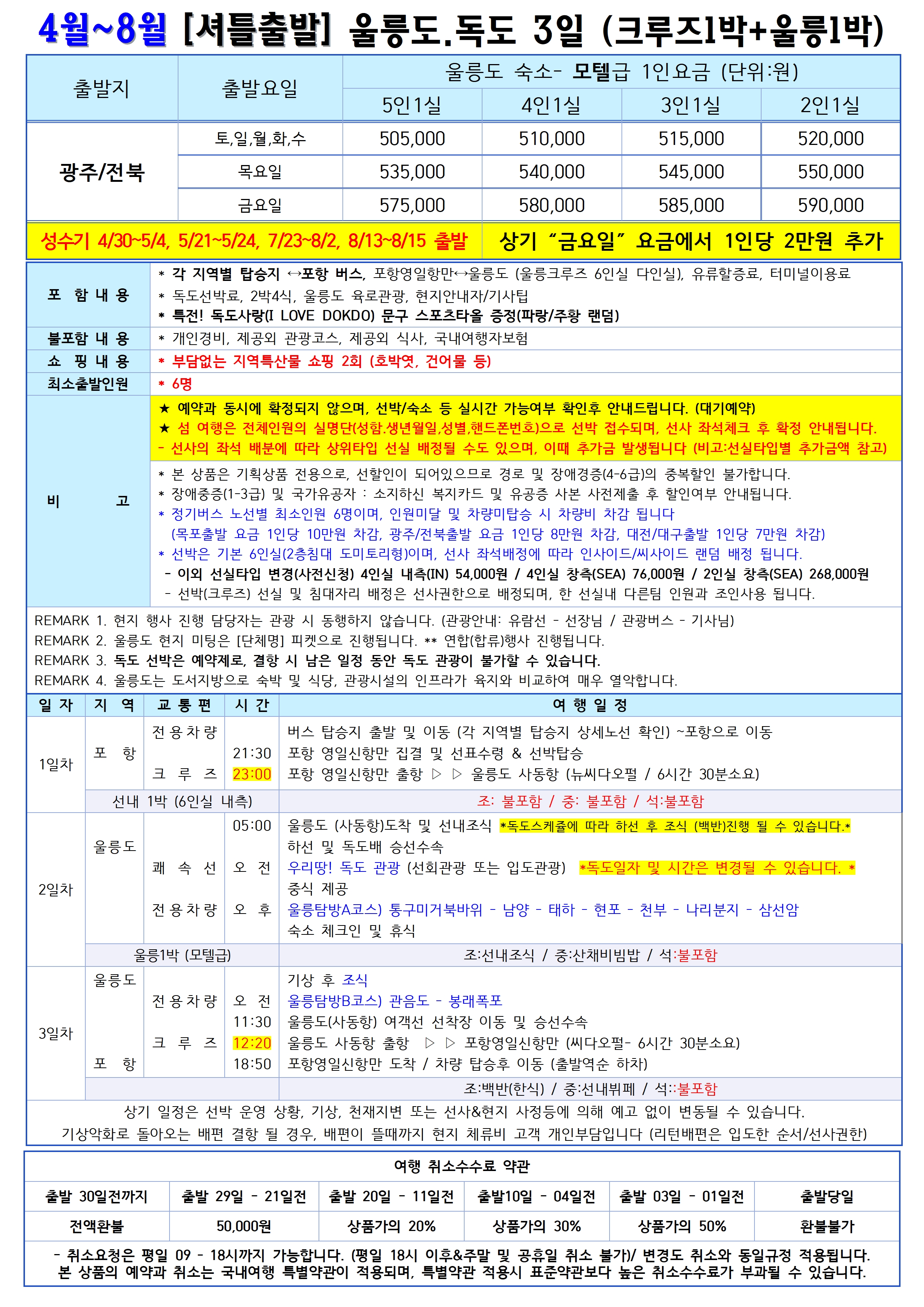 ※ 기상악화로 인한 선박 스케줄 변경 혹은 결항시에는 현지 추가비용(숙박, 식사, 교통편 등)은 고객 부담입니다.