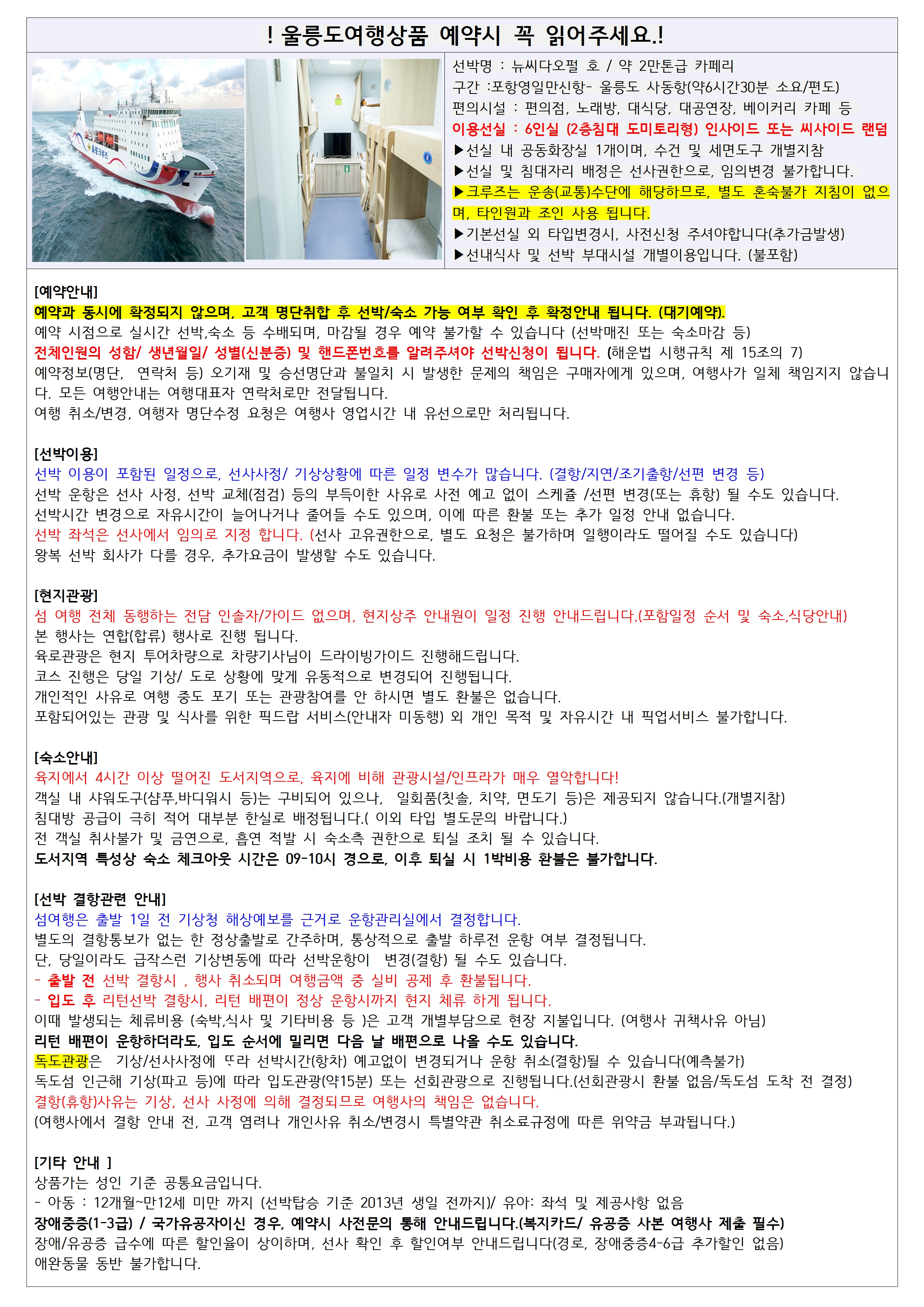 ※ 선박은 6인실 내측(창없는 선실) 왕복이용기준으로, 선실타입 변경시 사전문의 바랍니다.(추가금 별도)