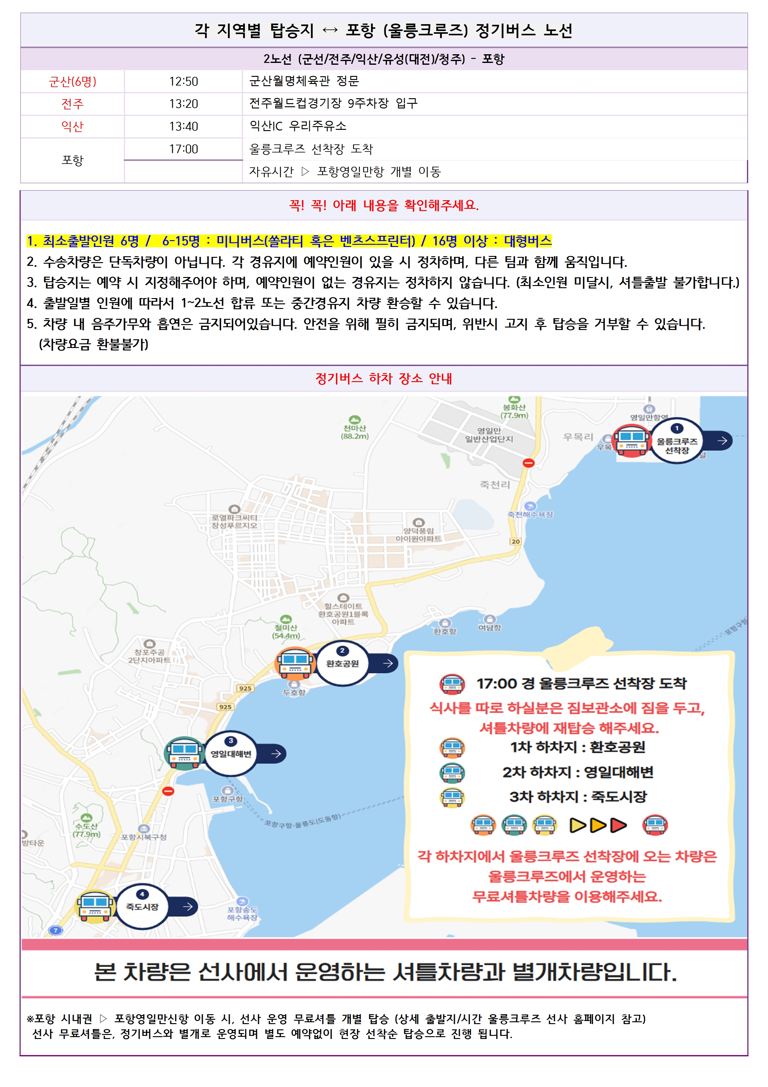 ※ 정기버스 노선별 최소인원 6명이며, 인원미달 및 차량 미탑승시 차량비 차감됩니다.(1인당 8만원)